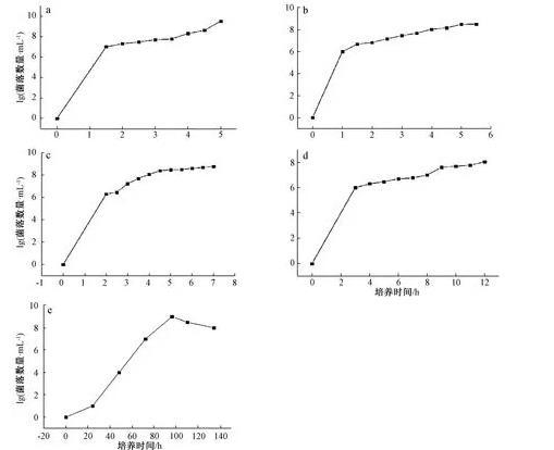 圖1大腸埃希菌(a)、金黃色葡萄球菌(b)、銅綠假單胞菌(c)、白色念珠菌(d)和黑曲霉(e)的生長曲線