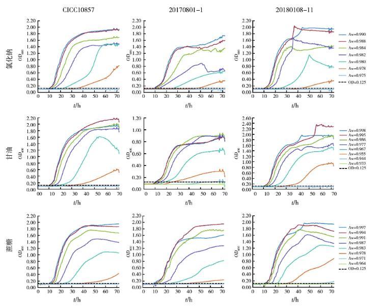 本研究選取2個(gè)Bcc的典型種作為研究對(duì)象,其中洋蔥伯克霍爾德菌(Burkholderiacepacia)2株,新洋蔥伯克霍爾德菌(Burkholderiacenocepacia)1株,分別在氯化鈉、甘油、蔗糖調(diào)節(jié)的不同Aw條件下培養(yǎng),通過(guò)全自動(dòng)生長(zhǎng)曲線分析儀繪制生長(zhǎng)曲線,探究不同調(diào)節(jié)劑作用下Bcc最低生長(zhǎng)Aw及Aw對(duì)其生長(zhǎng)曲線的影響。