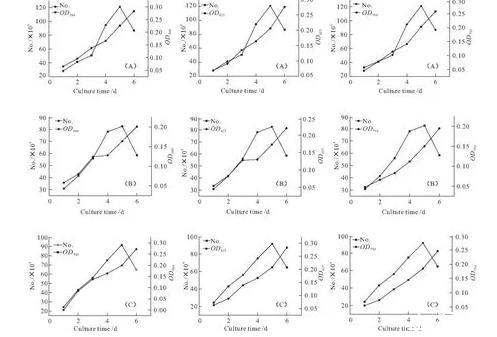 圖1朱氏四爿藻(A)、心形四爿藻(B)、大四爿藻(C)的生長曲線(根據(jù)幾組特定光密度值繪制)