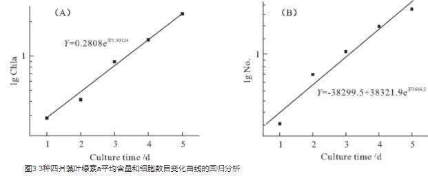 采用Origin v6.0作圖,分析生長曲線的差異,并對3種四爿藻據(jù)葉綠素a的平均含量繪制的生長曲線進(jìn)行回歸,并與細(xì)胞計(jì)數(shù)法得到的生長曲線回歸結(jié)果進(jìn)行比較。