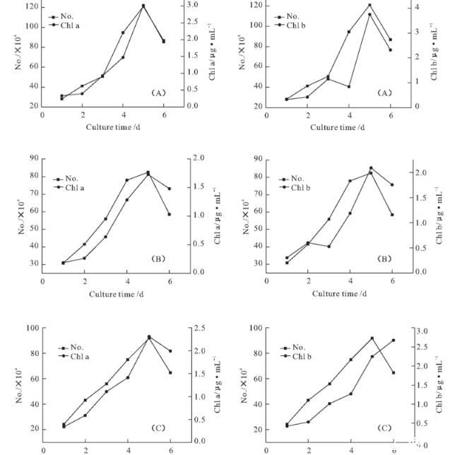 圖2朱氏四爿藻(A)、心形四爿藻(B)、大四爿藻(C)的生長曲線(根據(jù)葉綠素a、b含量繪制)