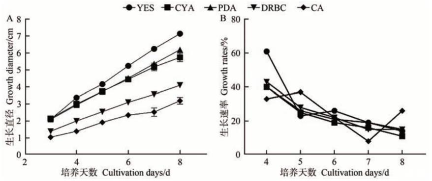 圖2 硫色曲霉在不同培養(yǎng)基上的生長直徑(A)和生長速率(B)