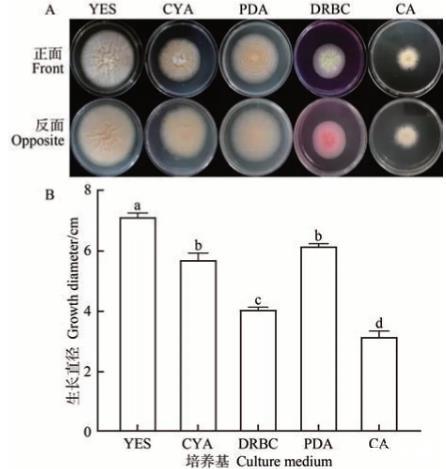 硫色曲霉在YES、PDA、CYA、DRBC、CA培養(yǎng)基上培養(yǎng)到第8天時(shí),菌落大小差異較大,顏色多呈黃、白色,孢子產(chǎn)量一般或極少,都有不同程度褶皺。菌落形態(tài)觀察如圖1-A所示。測量不同固體培養(yǎng)基上硫色曲霉的直徑,結(jié)果如圖1-B所示。
