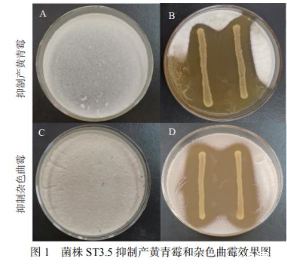 從泡菜中分離獲得34株分離菌株。分別以產(chǎn)黃青霉和雜色曲霉作為測(cè)試菌,通過瓊脂覆蓋法測(cè)定34株分離菌株對(duì)產(chǎn)黃青霉和雜色曲霉的抑制作用。結(jié)果表明菌株ST3.5的抑制效果最好。由圖1可知,與對(duì)照組相比較,接種的乳酸菌條帶具有顯著的抑制作用,其抑菌圈覆蓋面積超過50%,表明菌株ST3.5對(duì)產(chǎn)黃青霉和雜色曲霉均具有較強(qiáng)的抑菌效果。
