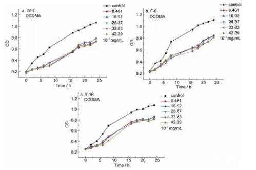 圖4 DCDMA對三種受試菌生長曲線的影響