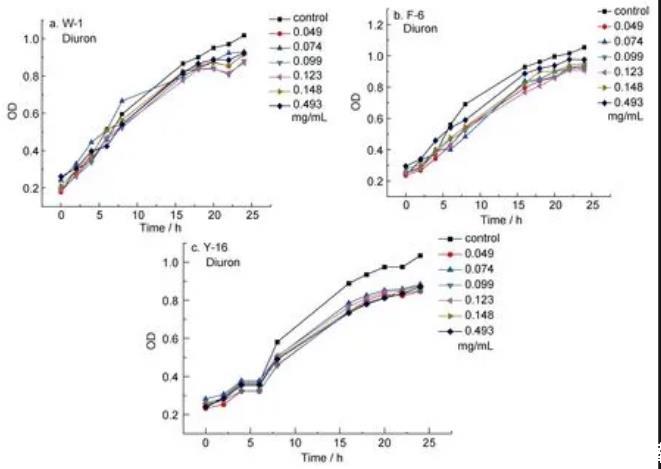 由圖5中3種受試菌的生長曲線可以看出,Diuron對海洋細(xì)菌的正常生長幾乎沒有影響,當(dāng)濃度高達(dá)0.493mg/mL時,依然沒有明顯抑制作用。印證了前面室內(nèi)掛板的結(jié)果。