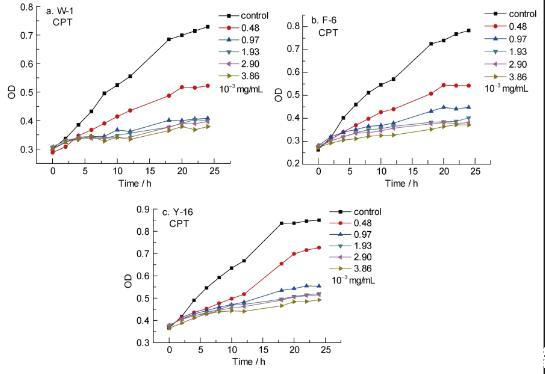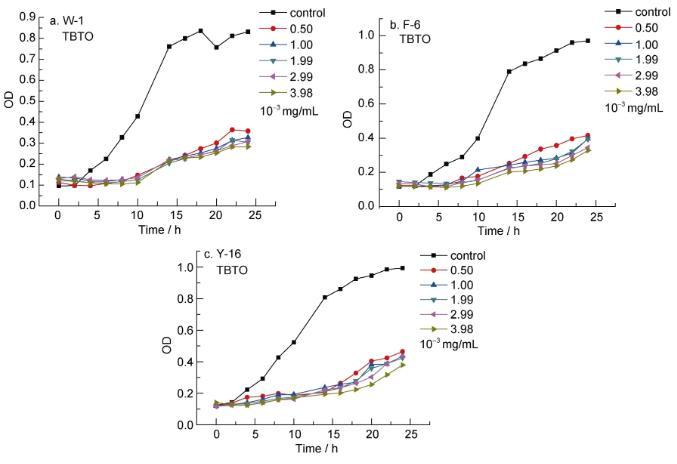對于CPT,整體來看,其抑菌性隨濃度增加而增加。但是,當(dāng)濃度達(dá)到0.97×10–3mg/mL后,繼續(xù)增大濃度,抑菌效果僅有輕微增加;并且隨時間延長,受試菌呈平穩(wěn)生長狀態(tài);對于TBTO,在各個試驗濃度下,均表現(xiàn)出了很好的抑菌效果,且濃度變化對抑菌效果影響不大。但隨時間的延長,在17.5h時,受試菌生長速率明顯加快,這或許和細(xì)菌的生長周期有關(guān);對于ZPT,在濃度低于1.91×10–3mg/mL時,抑菌效果不是太明顯,當(dāng)濃度達(dá)到1.91×10–3mg/mL時,才表現(xiàn)出明顯的抑菌性,繼續(xù)增大濃度對其影響不大。