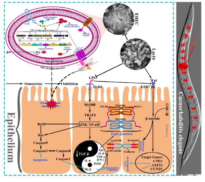 圖5、植物乳桿菌Lac16對(duì)腸出血性大腸桿菌O157:H7感染的保護(hù)作用的圖形總結(jié)。植物乳桿菌Lac16通過(guò)抑制大腸桿菌O157:H7的關(guān)鍵毒力特性和增強(qiáng)腸上皮屏障功能,減輕腸出血性大腸桿菌O157:H7感染誘導(dǎo)的對(duì)秀麗隱桿線蟲的毒性和LPS暴露誘導(dǎo)的腸上皮損傷,這可能是由激活的Wnt/β-catenin信號(hào)通路和抑制的TLR4-MyD88信號(hào)通路介導(dǎo)。