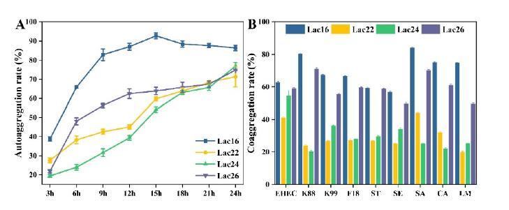 圖1、乳酸菌與人畜共患病原體的自聚集率(A)和共聚集率(B)。乳酸菌菌株的自聚集率隨時(shí)間逐漸增加,在24小時(shí)時(shí)達(dá)到70%以上,并且Lac16表現(xiàn)出比其他菌株更高(p<0.05)的自聚集率(Lac22,Lac24,Lac26)。