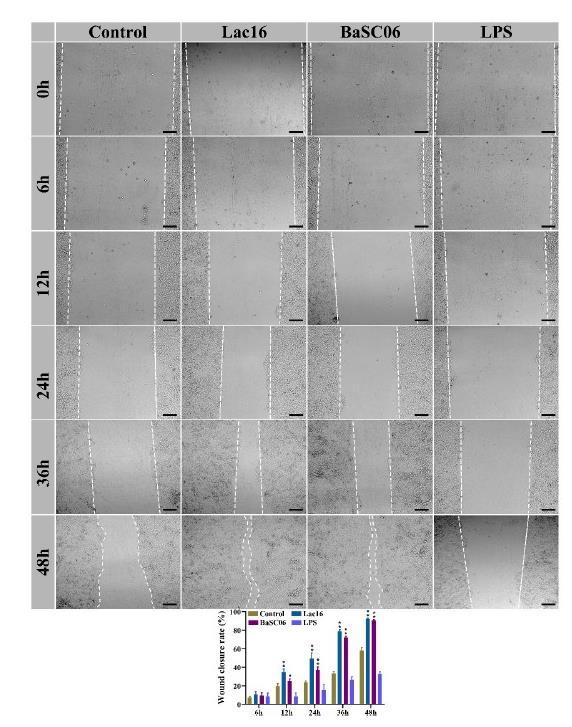 圖4、益生菌促進(jìn)IPEC-J2細(xì)胞的傷口閉合。IPEC-J2細(xì)胞用益生菌(MOI=100)或LPS(40μg/mL)處理不同時(shí)間。結(jié)果是三個(gè)獨(dú)立實(shí)驗(yàn)的平均值±標(biāo)準(zhǔn)偏差.