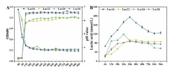 圖3、乳酸菌的生長(zhǎng)(A)、pH(A)和乳酸產(chǎn)量(B)。如圖所示,這四種菌株發(fā)酵培養(yǎng)物的pH值在穩(wěn)定期約為3.8。這四種菌株的乳酸產(chǎn)量在對(duì)數(shù)生長(zhǎng)期和早期穩(wěn)定期增加,而在晚期穩(wěn)定期減少。Lac16比其他三個(gè)菌株產(chǎn)生更高(p<0.05)的乳酸。