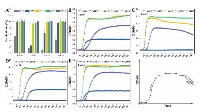 圖2、乳酸菌在不同pH值模擬胃腸液中的存活率(A)和生長(zhǎng)曲線(B-E,OD600值)。四種乳酸菌菌株(Lac16、Lac22、Lac24、Lac26)對(duì)pH 8.0的模擬腸液表現(xiàn)出良好的耐受性。Lac16和Lac26對(duì)模擬胃液表現(xiàn)出更好的耐受性,在pH 3.0和pH 4.0下的存活率幾乎為100%,而在pH 2.5下為40-55%(圖2A)。Lac24在pH 3.0下的存活率為62.28%。四種乳酸菌菌株可以在pH 4.0和pH 8.0下生長(zhǎng)良好,在固定相的吸光度值為0.9–1.8(圖2 B–E)。Lac16、Lac24和Lac26可以在pH 3.0下生長(zhǎng),固定相吸光度值為0.3–0.6(圖2是)。與pH 4.0和pH 6.4相比,這四種乳酸菌菌株的對(duì)數(shù)生長(zhǎng)期和靜止期在pH 3.0和pH 8.0時(shí)延遲。