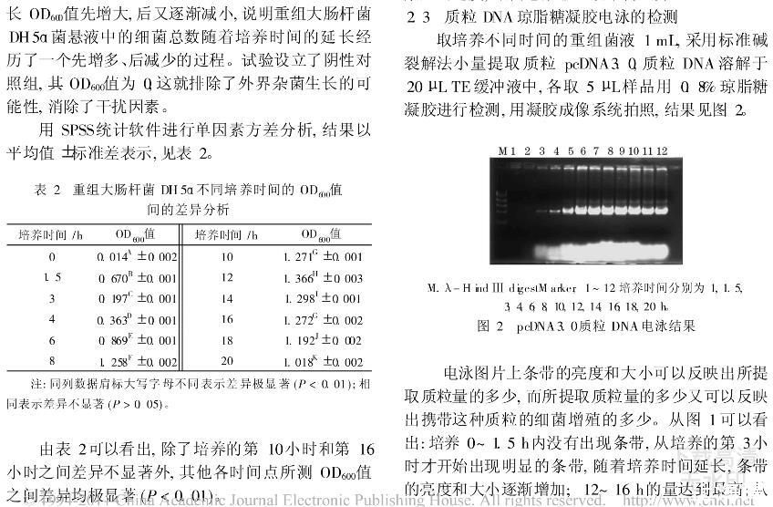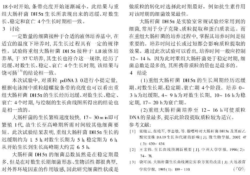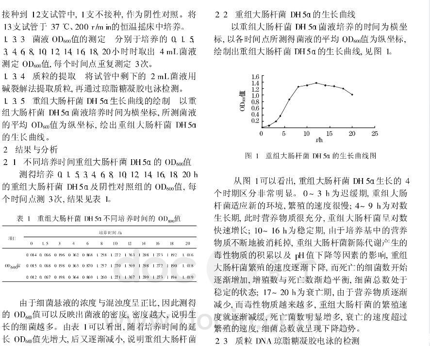 為了探討重組大腸桿菌適的培養(yǎng)時間,試驗將攜帶質(zhì)粒的重組大腸桿菌DH5α單菌落液體培養(yǎng)至OD600值為0.6左右,按一定比例接種于LB液體培養(yǎng)基中進行培養(yǎng),分別在0,1.5,3,4,6,8,10,12,14,16,18,20小時時取菌液,用分光光度計測定OD600值,以培養(yǎng)時間為橫坐標OD600值為縱坐標作重組菌生長曲線圖,同時提取質(zhì)粒比較不同培養(yǎng)時間質(zhì)粒量的變化。結(jié)果表明:重組大腸桿菌DH5α的生長經(jīng)歷了遲緩期對數(shù)期穩(wěn)定期衰亡期4個時期,符合細菌生長的規(guī)律;重組大腸桿菌生長至平臺期時提取質(zhì)粒的量最多。