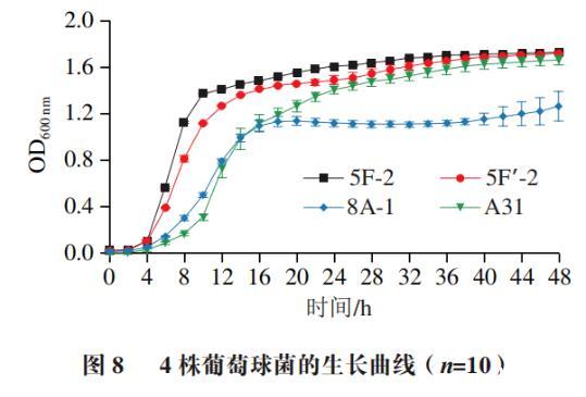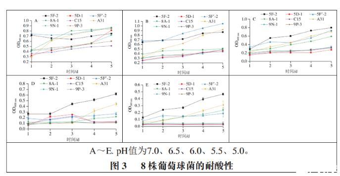由圖3可得,實(shí)驗(yàn)中8株葡萄球菌更適合在偏中性環(huán)境生長,酸性條件會在一定程度上影響菌株的生長能力,相同時(shí)間內(nèi)隨著pH值的下降,菌液濃度逐漸下降,菌株進(jìn)入生長對數(shù)期的時(shí)間逐漸延后。