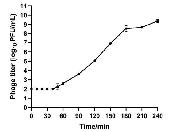 青枯雷爾氏菌LRS6在30℃下培養(yǎng)至A600=0.43(9log CFU/mL),500μL LRS6細(xì)菌懸浮液與500μL噬菌體液以最佳MOI=0.001混合,30℃條件下,讓噬菌體吸附10分鐘。接下來將混合物以12,000rpm離心5分鐘,去除上清液,并用NB培養(yǎng)基洗滌沉淀兩次以去除未吸附的噬菌體。將沉淀重懸于30℃的10mL NB培養(yǎng)基中,并以200rpm的速度搖動(dòng)。最后,前60分鐘每10分鐘測(cè)定一次噬菌體效價(jià),60分鐘后每30分鐘通過雙層板測(cè)量噬菌體的滴度,總共240分鐘。噬菌體LPRS20的一步生長(zhǎng)曲線測(cè)定結(jié)果如圖4所示,噬菌體LPRS20的潛伏期為40min,平均裂解量約為2450PFU/cell。裂解量=穩(wěn)定期噬菌體效價(jià)/受感染的細(xì)胞的濃度。