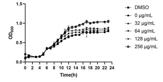 結(jié)果表明:在有效濃度范圍內(nèi)(32-256μg/mL),桉油精均不影響沙門氏菌SL1344的生長。
