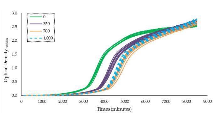 圖2、使用Bioscreen C分析儀獲得的生長曲線代表在0.94 aw下黃曲霉A7在600 nm下生長6天的光密度。每種測試濃度(0、350、700和1000μg/mL)代表十次重復(fù)。圖例中不同顏色的線顯示了不同精油的濃度。
