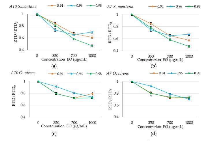 圖4、在不同濃度(0、350、700和1000μg/mL)的冬季香薄荷精油(SM)和牛至屬植物(OV)精油中相對檢測率(RTD)(RTD/RTD 0)的圖形表示;(a)SM精油的A10菌株,(b)SM精油的A7菌株,(c)OV精油的A10菌株和(d)OV精油的A7菌株。圖例中表示了所研究的不同w水平(0.94、0.96和0.96)。數(shù)據(jù)代表10次重復(fù)的相對RTD平均值。
