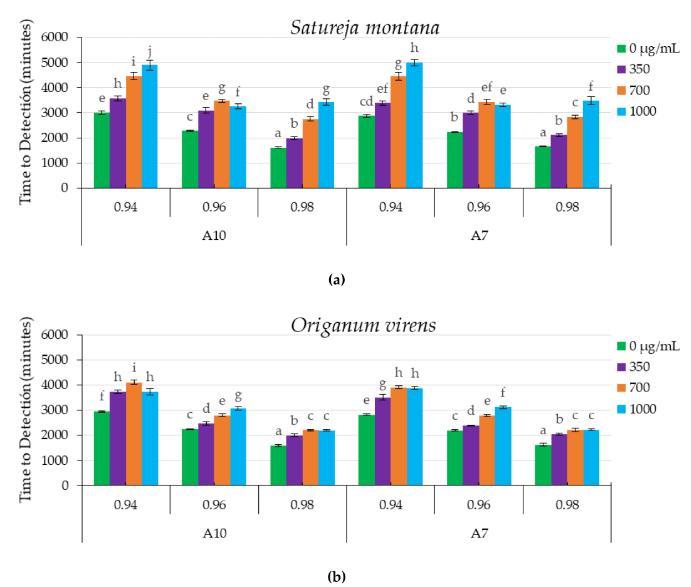 圖3、在不同水分活度(0.98、0.96和0.94 a w)下,兩種黃曲霉菌株(A10和A7)在0.2 nm的光密度(OD)下真菌生長的檢測時間(TTD,分鐘)濃度(0、350、700和1000μg/mL)的冬季香薄荷精油(a)和牛至屬植物(b)精油。值是10次重復(fù)的平均值±標(biāo)準(zhǔn)誤差。具有共同字母的均值無顯著差異(p>0.05)。圖例中顯示了精油的濃度。在所有情況下,對每種精油(EO)和分離物均獨立進行統(tǒng)計分析。