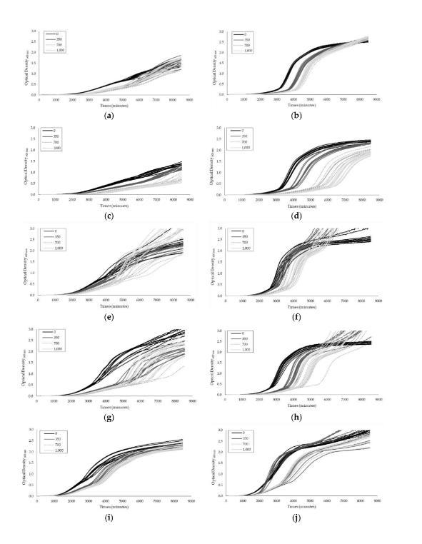 圖5、(a)生長曲線A10應(yīng)變在OV處為0.94 a w,(b)生長曲線A7應(yīng)變在OV處為0.94 a w,(c)生長曲線A10應(yīng)變在OV中為0.94 aw,(d)生長曲線A7應(yīng)變在OV處0.94 aw在SM,(e)生長曲線A10菌株在0.94 aw在OV,(f)生長曲線A7 0.96的應(yīng)變瓦特在OV,(g)在0.96aw的生長曲線A10菌株在SM,(h)SM中0.96aw的生長曲線A7應(yīng)變,(i)OV的生長曲線A10應(yīng)變?yōu)?.98aw,(j)OV的生長曲線A7應(yīng)變?yōu)?.98aw,(k)SM中的生長曲線A10應(yīng)變?yōu)?.98 aw(i)生長曲線A7應(yīng)變?yōu)?.98 aw在SM中。
