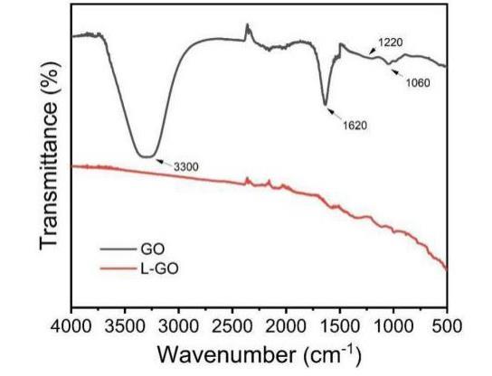 將GO與L-GO的紅外進行比較可以清晰地發(fā)現(xiàn),GO在3300cm-1附近觀察到吸收峰O-H伸縮振動,C=O在1724cm-1處來自羧基,C-O烷氧基在1060cm-1,C-O-C環(huán)氧基團在1220cm-1,C=C在1620cm-1處來自芳族結構的振動。而L-GO在這幾處都不存在明顯的吸收峰,說明L-半胱氨酸成功的與GO表面的基團進行了化學反應。