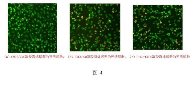 通過細胞毒性分析能更宏觀的表現(xiàn)出改性前后石墨烯的細胞毒性,通過對死活細胞進行熒光染色,使用共聚焦顯微鏡來拍攝照片。圖4所示為經過細胞培養(yǎng)皿培養(yǎng)出來的細胞,圖4a為經過CMCS/CMC凝膠海綿的浸出液培養(yǎng)出的細胞,可以看出染色后都是綠色細胞,為活細胞,說明該凝膠海綿具有無毒性。圖4b為經過CMCS-CMC/GO凝膠海綿的浸出液培養(yǎng)出來的細胞,可以看出綠色細胞明顯大幅度減少,黃細胞明顯增多(死細胞),說明該凝膠海綿具有相應的毒性。圖4c為經過CMCS-CMC/L-GO凝膠海綿的浸出液培養(yǎng)出來的細胞,與圖4b相比綠色細胞有明顯上升,黃色細胞有降低趨勢,這說明該凝膠海綿的細胞毒性要弱于圖4b組。這組死活細胞實驗直接證明了L-半胱氨酸改性后的凝膠海綿的生物相容性要有所增強,L-半胱氨酸對GO的改性是成功的。