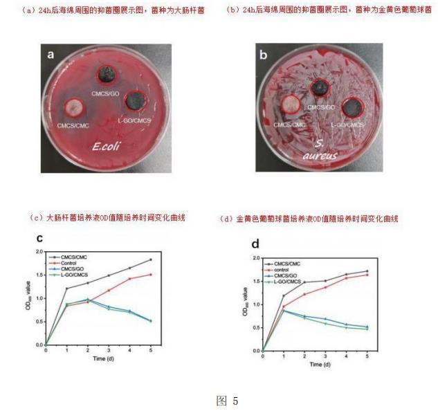 本實驗的革蘭氏陽性測試菌種選用的是金黃色葡萄球菌Staphylococcusaureus,革蘭氏陰性測試菌種采用的是大腸桿菌Escherichiacoli。通過抑菌環(huán)實驗測得各樣品的抑菌環(huán)直徑后對其進行細菌定量計數實驗,并通過不同時間段的OD值繪制生長曲線。圖5所示,a和b分別是大腸桿菌培養(yǎng)皿和金黃色葡萄球菌培養(yǎng)皿,而c和d分別代表大腸桿菌OD值和金黃色葡萄球菌OD值。OD值越大,透光率越小,細菌越多。c圖和d圖顯示了三組凝膠海綿和一組對照實驗的OD值,可以看到在最開始的一天時間內,四組實驗測試的OD值均呈上升趨勢,而CMCS/CMC凝膠海綿實驗的OD值最高,空白對照次之,這表明在開始的一天內,四組實驗的抗菌效果都很弱,但是CMCS/GO海綿和L-GO/CMCS海綿的抗菌效果相比于其他兩組較強。在第二天至第五天,CMCS/CMC凝膠海綿和空白對照實驗的OD值仍然上升,細菌持續(xù)增長,但是在c圖大腸桿菌的實驗中,CMCS/GO海綿與L-GO/CMCS海綿第一天與第二天的區(qū)間里細菌數量上升減緩,而從第二天以后OD值下降,第五天均降至0.5附近,表明這兩組海綿的抗菌作用顯著。在d圖金黃色葡萄球菌的實驗中,從第一天以后CMCS/CMC和L-GO/CMCS凝膠海綿的OD值均極速下降至0.5附近,這表明這兩組海綿具有優(yōu)異的抗菌性能,與另外兩組形成鮮明反差,且L-半胱氨酸對GO的改性并沒有破壞GO原有的抗菌性。