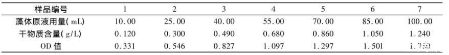 分別吸取10.00 mL、25.00 mL、40.00 mL、55.00 mL、70.00 mL、85.00 mL、100.00 mL藻體原液于相應編號的100 mL容量瓶中,加培養(yǎng)液至刻度線,搖勻。在560 nm波長下測定光密度(Optical Density,簡稱OD),結果見表1。