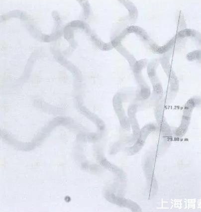 圖1是螺旋藻的顯微鏡圖。由圖可見,螺旋藻呈藍綠色,為絲狀體藻絲螺旋狀,藻絲長500-650μm,藻絲直徑約29μm,頂端鈍圓或略尖細,末端細胞寬圓形。