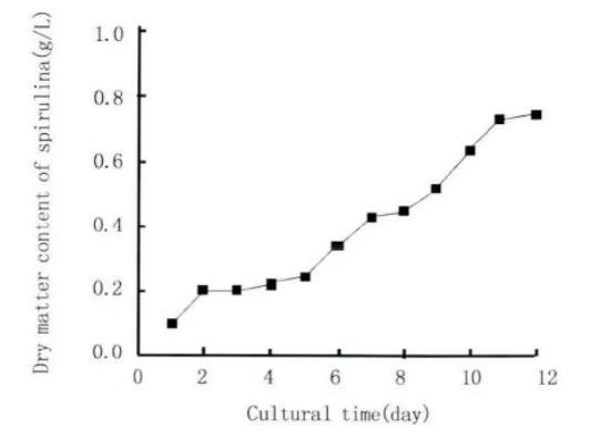 圖3是用日光燈照射培養(yǎng)螺旋藻的生長曲線,隨著養(yǎng)殖時間增加,螺旋藻干物質含量呈上升趨勢;在2 d~5 d生長速率較慢,為緩慢增長期;在5 d~11 d生長速率較快,呈對數(shù)增長,為快速增長期;在11 d達到了生長的最大濃度,干物質含量為0.742 g/L,是初始含量的7倍。