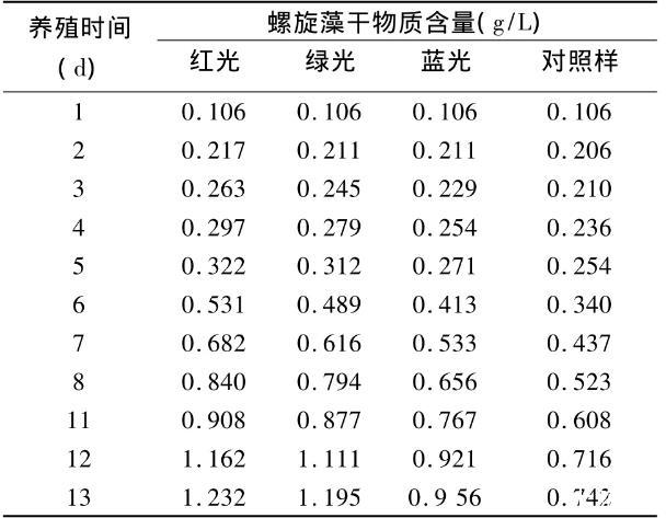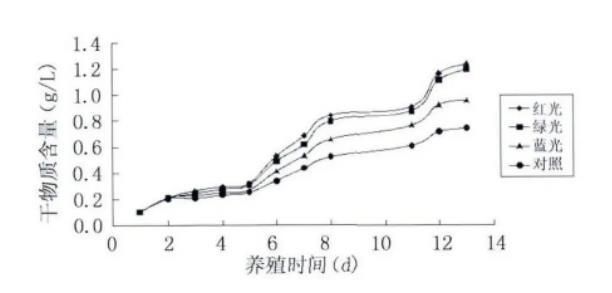 由表2數(shù)據(jù)畫圖得圖4,對照樣采用日光燈照射。從表和圖可以看出,采用紅綠藍光處理過的螺旋藻生長量明顯高于對照樣。經(jīng)過13 d養(yǎng)殖,螺旋藻干物質含量到達最大,紅光處理的為1.232 g/L,綠色處理的為1.195 g/L,藍色處理的為0.956 g/L,對照樣的為0.742 g/L。紅光處理過的螺旋藻干物質含量最大,比對照樣增加了66.04%。
