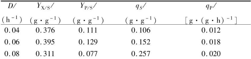 表2不同稀釋率S.albulus M-Z18恒化培養(yǎng)(pH 4.0)動力學(xué)參數(shù)