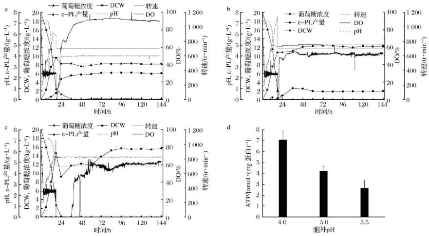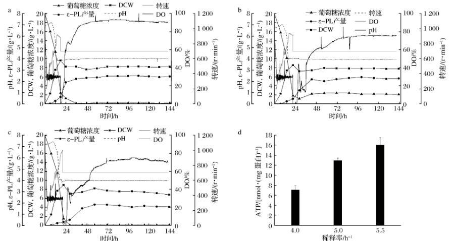 另外,不同稀釋率恒化體系中菌體胞內(nèi)ATP濃度檢測發(fā)現(xiàn),稀釋率為0.04、0.06和0.08 h-1時,胞內(nèi)ATP濃度分別為(7.11±0.80)、(12.98±0.45)和(16.06±1.41)nmol/mg蛋白。相比于D=0.04 h-1、D=0.06 h-1胞內(nèi)ATP增加了82.5%左右,約6 nmol/mg蛋白。而相比于D=0.06 h-1、D=0.08 h-1胞內(nèi)ATP僅增加了23.7%,約3 nmol/mg蛋白。綜上,在恒定pH 4.0時,菌體比生長速率越高,底物葡萄糖消耗速率、ε-PL比生成速率和胞內(nèi)ATP濃度就越大,而細胞得率和ε-PL得率(YP/S)卻在總體下降。由此可以看出,隨著菌體比生長速率提高,底物葡萄糖消耗速率加快,更多的葡萄糖流向了菌體合成和ATP生產(chǎn),但是ε-PL比生成速率提高不顯著,而YP/S下降明顯(特別是在D=0.08 h-1時),故過高的菌體比生長速率會降低發(fā)酵的經(jīng)濟性。因此,在發(fā)酵過程中,除了將pH控制在合適范圍內(nèi),也需要調(diào)節(jié)菌體的生長速率保持在合理區(qū)間(如0.06 h-1左右),才能實現(xiàn)ε-PL的最高效發(fā)酵。