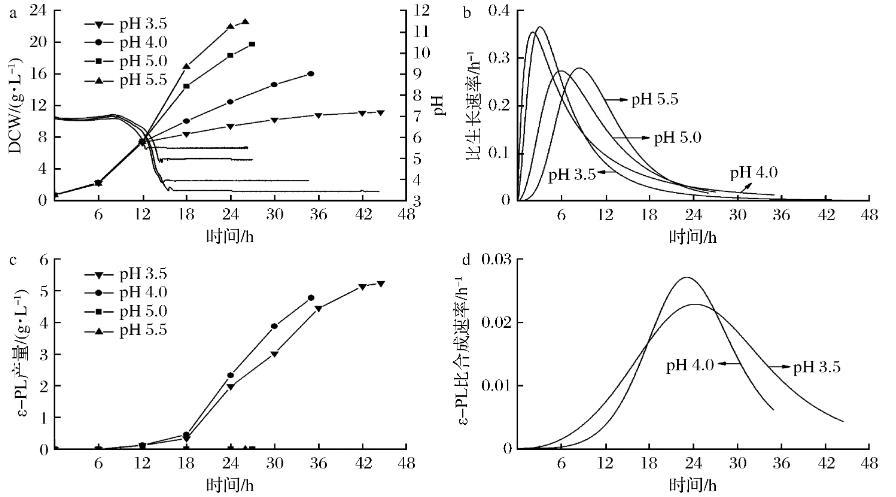 a-菌體生長;b-比生長速率;c-ε-PL產(chǎn)量;d-ε-PL比合成速率圖1 pH值對分批發(fā)酵過程參數(shù)的影響