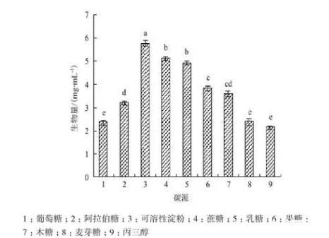 2.6.1碳源Act0988菌株供試的9種碳源都能生長(zhǎng),但生物量差異較大。其中,可溶性淀粉培養(yǎng)基的生物量最大,為5.8 mg/mL,與其它碳源培養(yǎng)基生物量的顯著差異;其次是蔗糖和乳糖,發(fā)酵液生物量分別為5.1 mg/mL和5.0 mg/mL,兩者間差異不顯著;菌株在葡萄糖、麥芽糖、丙三醇碳源培養(yǎng)基中生長(zhǎng)均較差(圖6)。