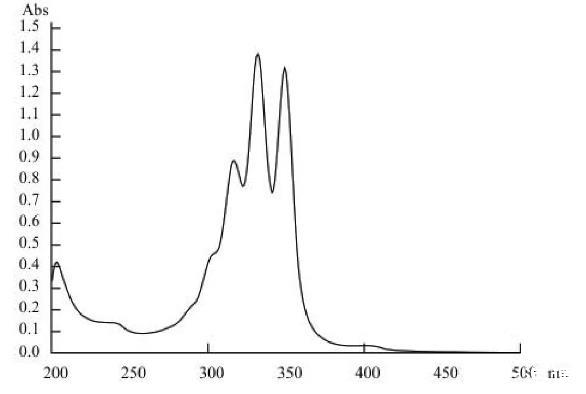 1.2.3菌株產(chǎn)抗菌物質(zhì)的吸收光譜菌株發(fā)酵液經(jīng)10 000 r/min離心20 min,沉淀加2倍體積無水甲醇充分混勻、浸泡,離心,上清液冷凍干燥得粉末粗提物。粗提物再以無水甲醇溶解、離心,上清液冷凍干燥,樣品再以沃特世1525半制備/分析HPLC純化,收集350 nm主峰洗脫液,凍干后以無水甲醇溶解,無水甲醇做基線,在190-1 100 nm內(nèi)進(jìn)行光譜掃描得菌株產(chǎn)抗菌物質(zhì)的吸收光譜。