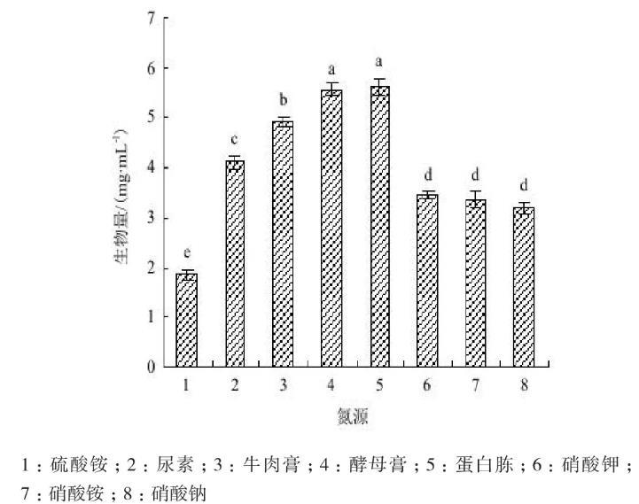 2.6.2氮源供試氮源與Act0988菌株生長(zhǎng)的關(guān)系(圖7)表明,菌株對(duì)所有供試氮源都能利用,在以酵母膏與蛋白胨為氮源的培養(yǎng)基中的生物量最大,為5.7 mg/mL左右,兩者差異不顯著(P<0.05);牛肉膏培養(yǎng)基的生物量為4.9 mg/mL,尿素培養(yǎng)基的生物量為4.1 mg/mL。菌株以KNO3、NH4NO3或NaNO3為氮源的生物量顯著低于有機(jī)氮源,(NH4)2SO4氮源培養(yǎng)的生物量最低。結(jié)果表明,供試生化試劑類有機(jī)氮源最利于菌株生長(zhǎng)。