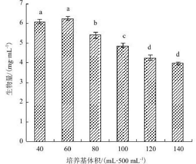 2.7.3裝液量Act0988菌株在不同裝液量的三角瓶內(nèi)培養(yǎng)96 h的生物量(圖10)顯示,裝液量為40 mL和60 mL處理的生長最佳,生物量分別為6.1 mg/mL和6.3 mg/mL,兩者間差異不顯著,且都顯著高于其他裝液量處理的生物量;裝量為120 mL和140 mL菌株的生長最差,生物量僅為4.3 mg/mL和4.0 mg/mL。結(jié)果表明,菌株生長對溶氧的需求量較大。