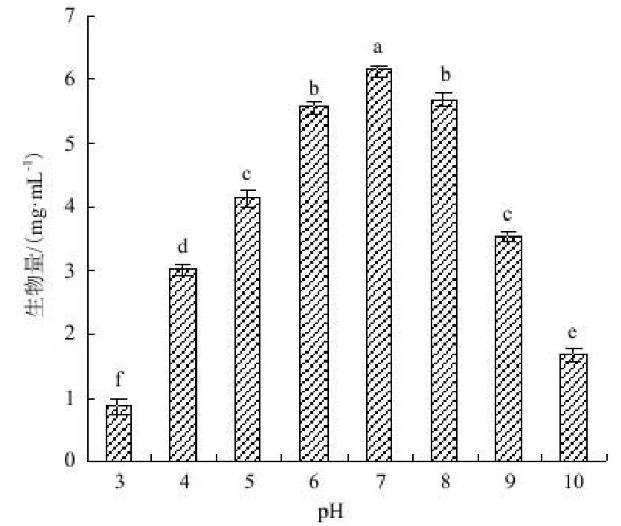2.7.2 pH不同初始pH培養(yǎng)Act0988菌株的生物量(圖9)顯示,菌株經(jīng)pH7處理的生長最好,生物量為6.2 mg/mL,與其他處理間的差異顯著(P>0.05)。其次,pH=6、8處理發(fā)酵液生物量分別為5.6 mg/mL和5.7 mg/mL。其余5個(gè)pH培養(yǎng)基發(fā)酵液的生物量顯著低于前3個(gè)pH處理的發(fā)酵液的生物量。結(jié)果表明,菌株生長適宜中性及弱酸、弱堿條件。