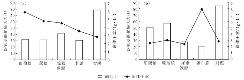 分別添加1%的葡萄糖、蔗糖、淀粉、甘油,0.5%的硝酸鈉、硫酸銨、尿素、蛋白胨,以發(fā)酵培養(yǎng)基為對照,考察不同碳、氮源對菌株A55的生長及酶活力的影響,結(jié)果見圖4。