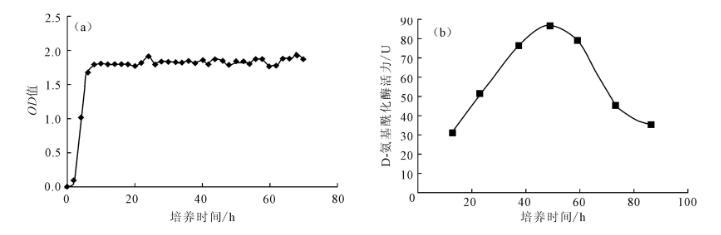 菌株A55所產(chǎn)的D-氨基酰化酶屬于誘導(dǎo)酶,只有在培養(yǎng)基中添加N-乙?;被嶙鳛檎T導(dǎo)物時,菌株才能合成D-氨基?;?。菌株A55的生長曲線及菌齡對酶活力的影響見圖3。