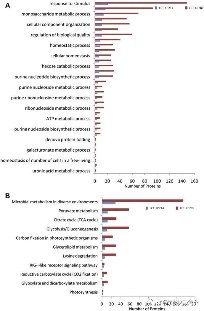 圖5、圖a和圖b表示的是太空飛行的肺炎克雷伯菌株LCT-KP289差異表達(dá)蛋白的GO富集分析和KEGG通路富集分析,對(duì)照染色體為L(zhǎng)CT-KP214。紅色和藍(lán)色列分別表示LCT-KP289和LCT-KP214。注釋軸按功能分類示意圖。這些列表標(biāo)注了菌株中所有帶注釋的蛋白的數(shù)量。