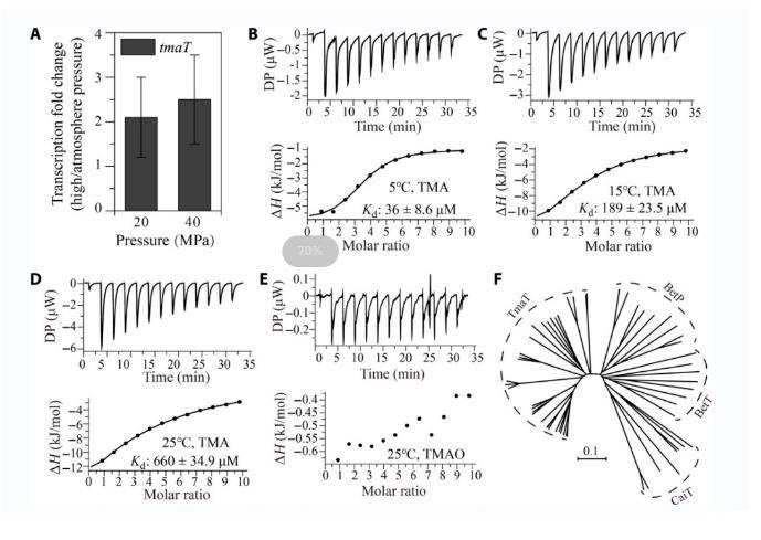 圖3、TmaT的表征。(A)實(shí)時(shí)定量PCR檢測靜水壓力對菌株D25基因tmaT表達(dá)的影響。菌株D25在2216E培養(yǎng)基中在大氣壓、20或40 MPa下培養(yǎng)1小時(shí)。誤差條代表來自三次實(shí)驗(yàn)的SD。(B到E)將TMA或TMAO滴定為TmaT的ITC曲線。顯示了ITC跡線(頂部)和綜合結(jié)合等溫線(底部)。滴定底物和溫度如圖所示。(F)TmaT及其與其他BCCT轉(zhuǎn)運(yùn)蛋白的同源物的分子系統(tǒng)發(fā)育分析。序列來自IMG/JGI數(shù)據(jù)庫。BetP、BetT和CaiT分別是甘氨酸甜菜堿、膽堿和肉堿的BCCT轉(zhuǎn)運(yùn)蛋白。