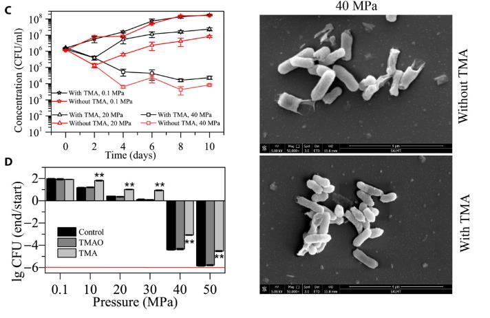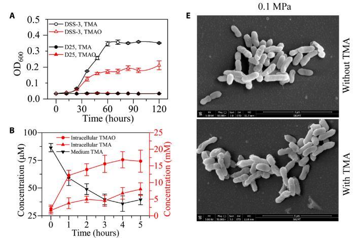 圖1、(A)以TMA或TMAO為唯一氮源培養(yǎng)的菌株D25和DSS-3的生長曲線。(B)D25菌株在初始TMA濃度為85μM的2216E培養(yǎng)基中培養(yǎng)的TMA和胞內(nèi)TMA和TMAO濃度的變化。(C)應(yīng)變D25菌株在4°C下在0.1、20和40 MPa下添加或不添加10μM TMA的生長曲線。(D)10μM TMAO或TMA對菌株D25在不同壓力下生長和存活的影響。孵育開始(開始)時(shí)的細(xì)胞數(shù)約為1×10 6CFU/毫升。將培養(yǎng)物在4°C下培養(yǎng)10天,然后計(jì)算CFU并與起始培養(yǎng)物的CFU進(jìn)行比較。紅線是指培養(yǎng)物中細(xì)胞的完全死亡對照。在沒有TMAO或TMA的情況下培養(yǎng)的菌株D25。(E)D25菌株在不同壓力下添加或不添加10μM TMA的形態(tài)學(xué)觀察。
