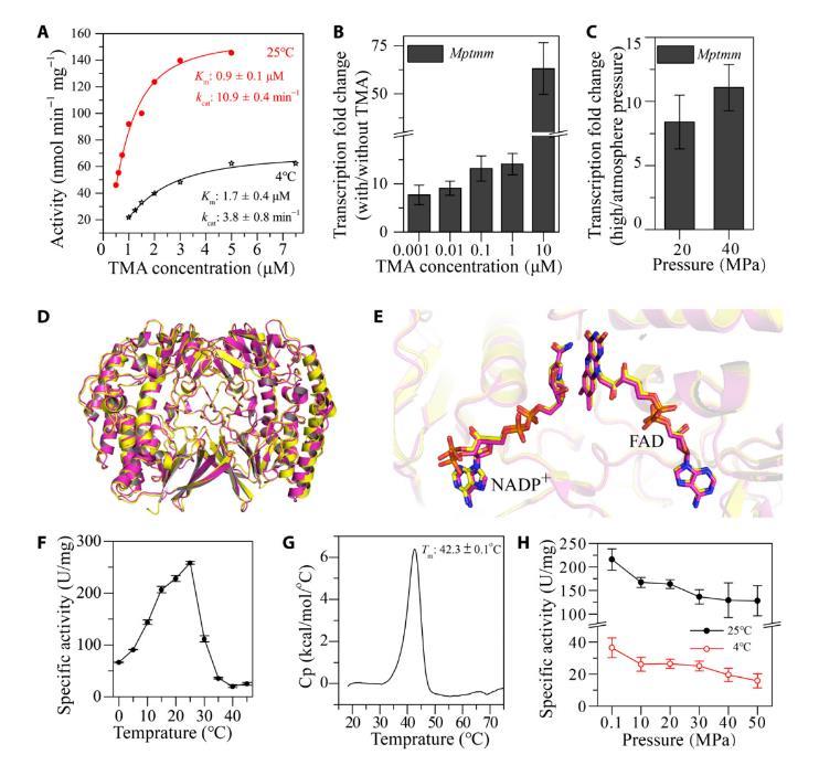 圖2、(A)重組Mp Tmm在4°和25°C下氧化TMA的非線性擬合曲線。(B)不同濃度TMA對D25菌株Mptmm基因表達(dá)的影響。菌株D25在有或沒有TMA的2216E培養(yǎng)基中培養(yǎng)1小時(shí)。(C)靜水壓力對D25菌株Mptmm基因表達(dá)的影響。菌株D25在2216E培養(yǎng)基中在大氣壓、20或40 MPa下培養(yǎng)1小時(shí)。(D)Mp Tmm和Rn Tmm的結(jié)構(gòu)比較。Mp Tmm為黃色,Rn Tmm為紫色。(E)Mp Tmm和Rn Tmm晶體結(jié)構(gòu)中NADP+(左)和FAD(右)位置的比較。FAD和NADP+分子顯示為Mp Tmm為黃色和Rn Tmm為紫色的棒。(F)溫度對Mp Tmm活性的影響。(G)DSC測量Mp Tmm的T m值。(H)分別在25°和4°C測量不同壓力下的酶活性。