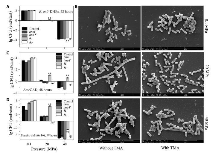 圖5、TmaT和Mp Tmm在重組大腸桿菌DH5α、大腸桿菌突變體Δtor CAD和枯草芽孢桿菌168中的體內(nèi)功能。(A,C,和D)TmaT和Mp Tmm的表達(dá)對大腸桿菌DH5α(A)、Δtor CAD(C)和B.subtilis 168(D)在不同壓力下48小時(shí)培養(yǎng)的生長和存活的影響。孵育開始(開始)時(shí)的細(xì)胞數(shù)約為1×105 CFU/毫升。將菌株在25°C下培養(yǎng)48小時(shí),加入或不加入20μM TMA,然后計(jì)數(shù)CFU并與起始培養(yǎng)物(結(jié)束/開始)進(jìn)行比較。(B)Δtor CAD共表達(dá)TmaT和Mp Tmm的細(xì)胞在25°C不同壓力下加或不加20μM TMA培養(yǎng)48小時(shí)的形態(tài)學(xué)觀察。