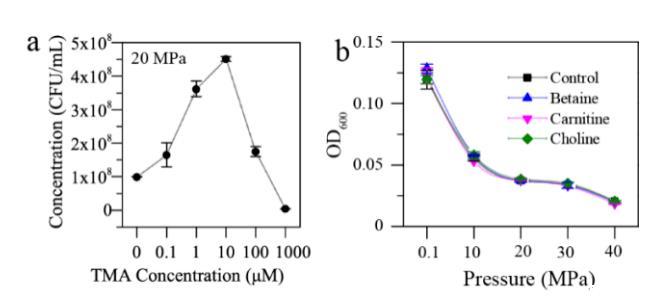 圖4、TMA等季胺對菌株D25在高溫高壓下生長的影響。a)不同濃度的TMA對菌株D25在20 MPa下生長的影響。培養(yǎng)基由3%人工海鹽、0.05%蛋白胨、0.01%酵母粉和不同濃度的TMA組成。培養(yǎng)物在25℃下培養(yǎng)2天。b)不同壓力下季胺對菌株D25生長的影響。培養(yǎng)基中添加3%人工海鹽、0.05%蛋白胨、0.01%酵母粉和20μM季胺。培養(yǎng)物在25℃下培養(yǎng)2天??刂?,不含季胺。誤差條表示三次重復(fù)實(shí)驗(yàn)的標(biāo)準(zhǔn)差。