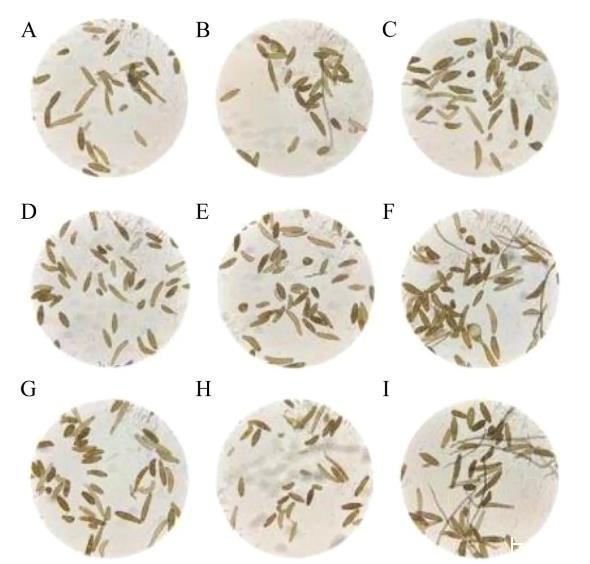 圖4拮抗菌發(fā)酵液對玉米小斑病菌分生孢子萌發(fā)的抑制(400×)A–C分別為菌株S1、短小芽孢桿菌103925發(fā)酵液處理和空白對照組的第2 h玉米小斑病菌分生孢子萌發(fā)情況.D–F分別為菌株S1、短小芽孢桿菌103925發(fā)酵液處理和空白對照組的第4 h玉米小斑病菌分生孢子萌發(fā)情況.G–I分別為菌株S1、短小芽孢桿菌103925發(fā)酵液處理和空白對照組的第6 h玉米小斑病菌分生孢子萌發(fā)情況