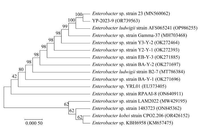 圖2基于菌株YP-2023-9的16S rRNA基因序列構(gòu)建的系統(tǒng)發(fā)育樹括號內(nèi)數(shù)值為GenBank登錄號;分支上的數(shù)值表示bootstrap的支持率;標(biāo)尺0.000 50表示序列的進(jìn)化差異
