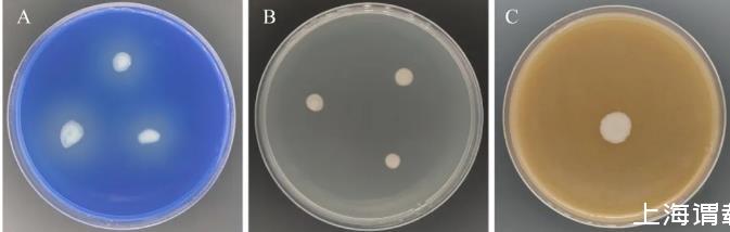 圖4菌株YP-2023-9在苯胺藍(lán)平板(A)、愈創(chuàng)木酚平板(B)及煙梗平板上(C)的生長情況